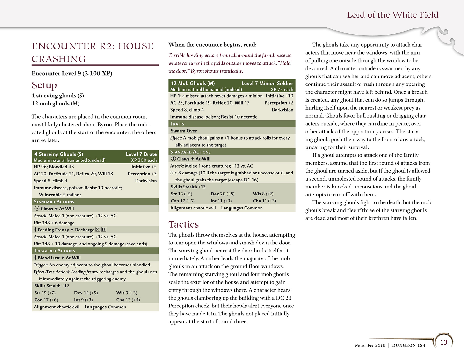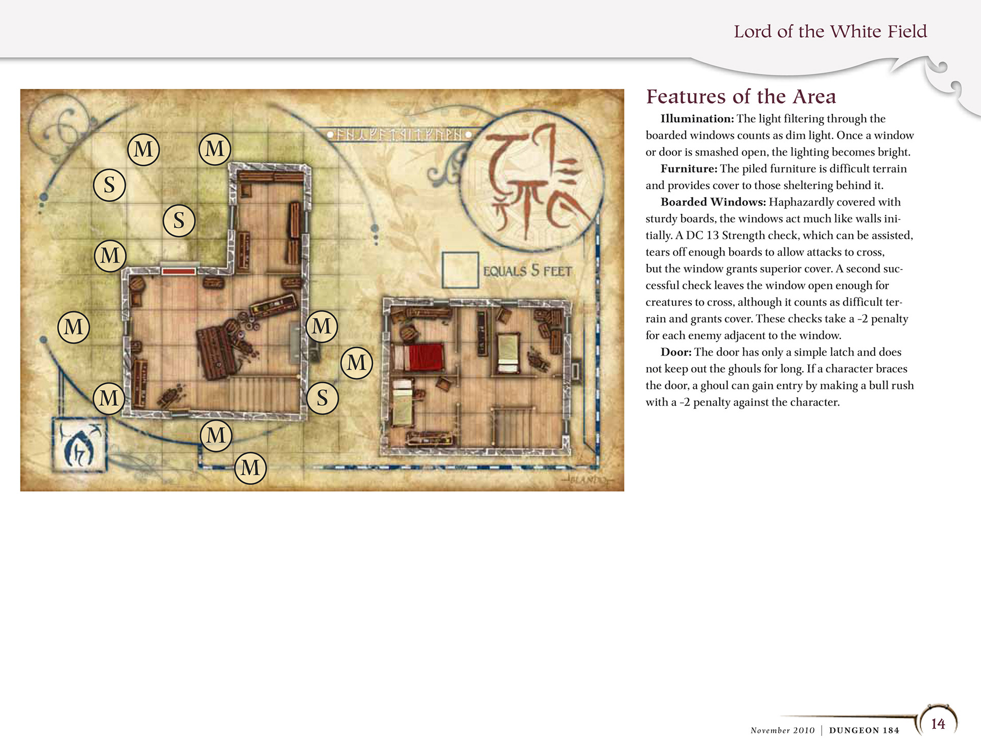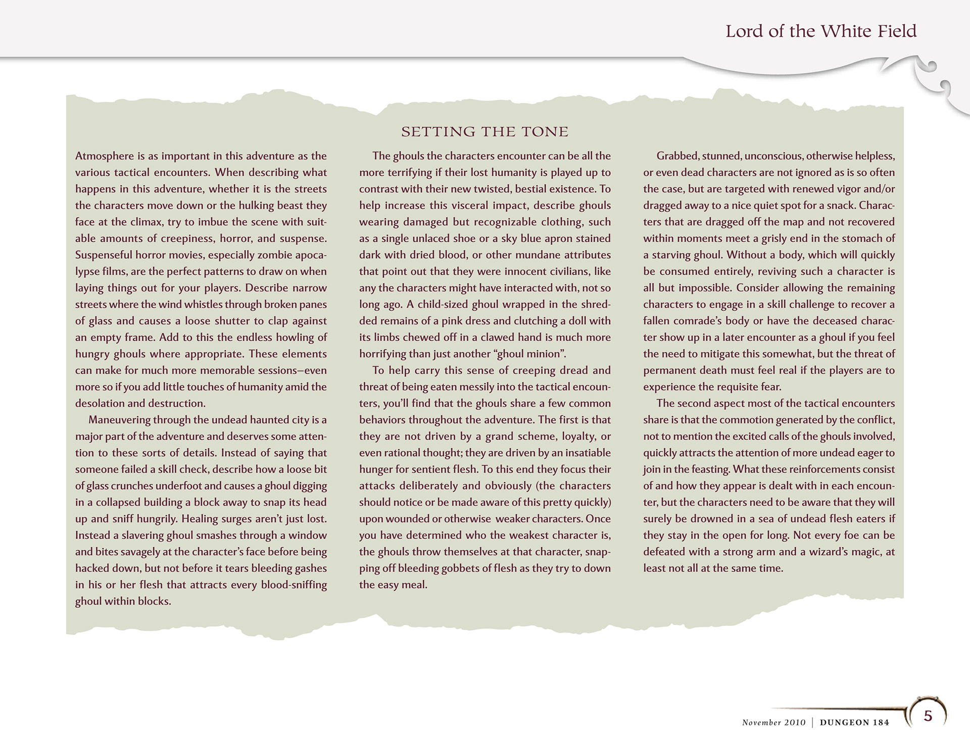 Lord of the White Field was a horror/suspense adventure written for Dungeon that went on to become the most popular of 2011. It deals with ghoul-fueled apocalyptic themes by combining classic crawl fare with new mechanics designed to take it to the next level while keeping things familiar and easy to use. As atmosphere is so crucial to the genre, everything was arranged to help promote a feeling of teetering on the edge, of facing down odds that just couldn’t be overcome by dint of arms.