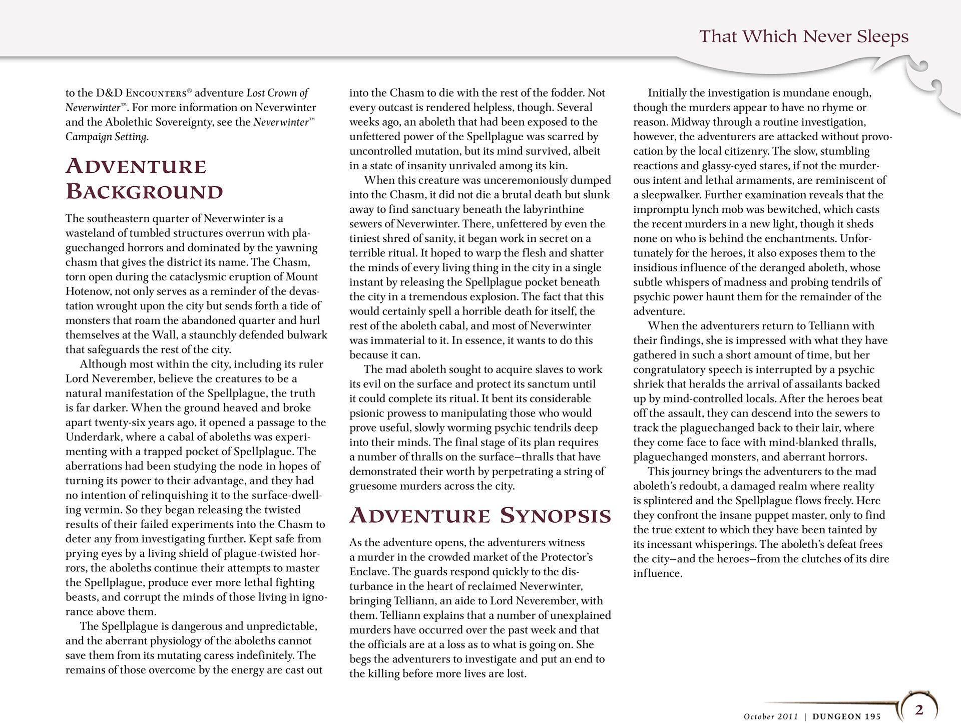 195, That Which Never Sleeps is a murder mystery with a chthonic (in more than one way) twist. It was great fun to write, even if my laboriously produced rune map of Neverwinter never saw the light of day.